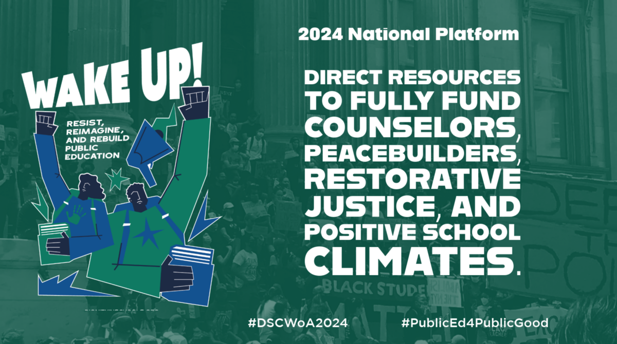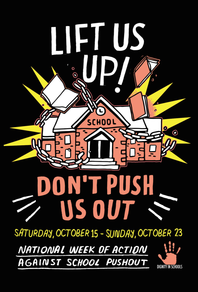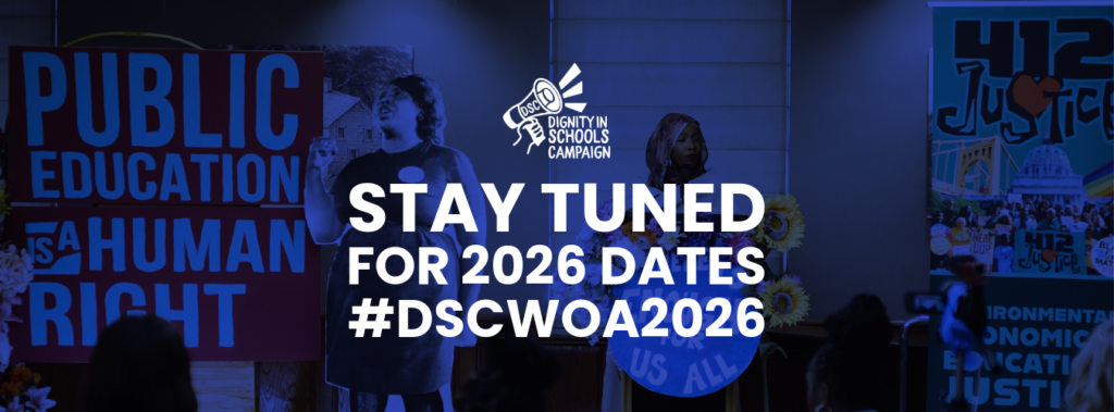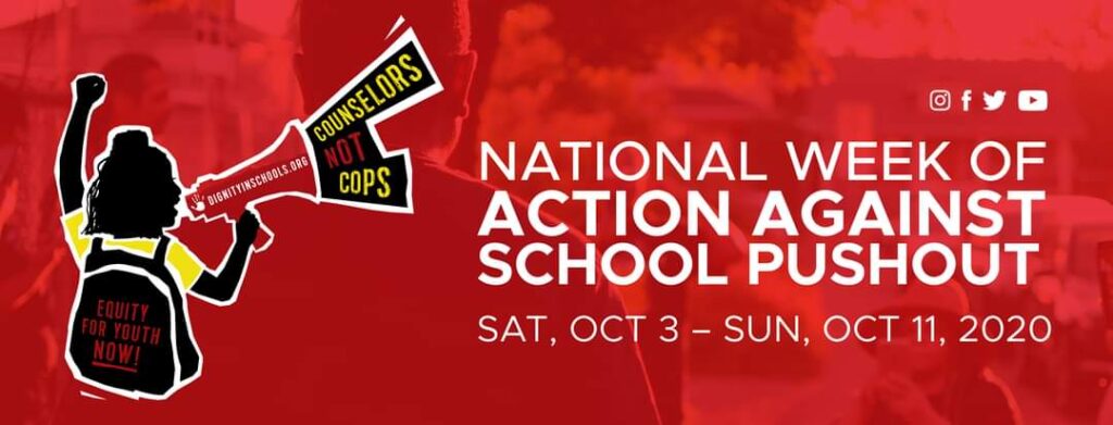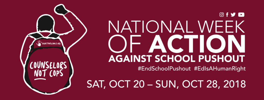 Each October, members of the Dignity in Schools Campaign (DSC), a national coalition of over 100 organizations, host a series of events, teach-ins, rallies, protests and workshops across the country designed to bring attention to the ongoing and devastating impacts of school policing and zero-tolerance discipline policies. National Week of Action Against School Pushout will bring students, parents, education advocates, lawyers and many others committed to social and educational justice together to amplify the nationwide call for schools to move away from punitive, cold, criminalizing policies and towards emotionally-safe, restorative and culturally responsive school communities.